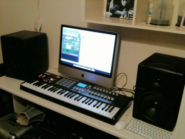 pic below of part 1 of my production gear containing 24" i mac, akai mpk61 midi control keyboard and 2 x mackie mr8's